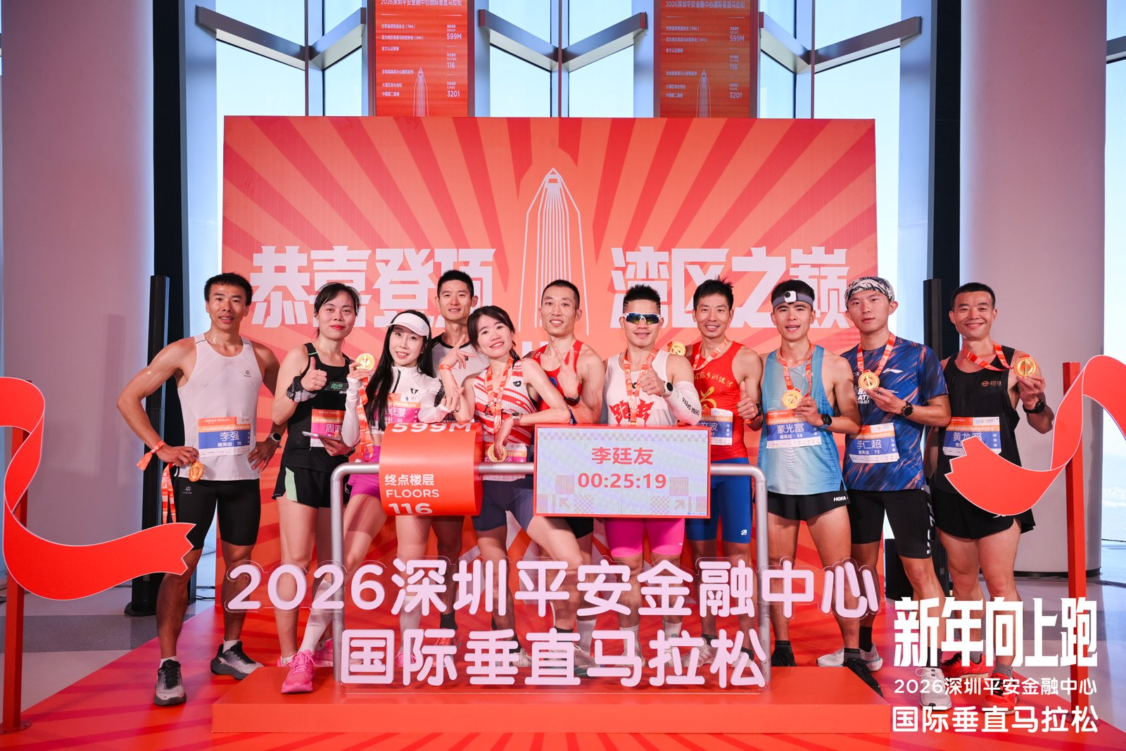 当天上午,参赛选手们分组从深圳平安金融中心西大堂起跑,经3201级台阶抵达位于深圳平安金融中心116层“云际观光层”的终点。