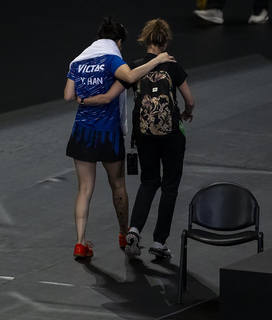 当地时间2024年1月11日,2024WTT多哈球星挑战赛女单1/16决赛,韩莹因跟腱断裂退赛。视觉中国 图